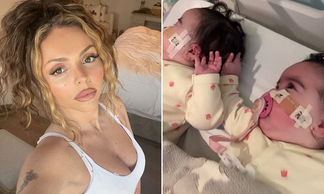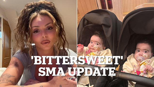Jesy Nelson flaunts her body art in a short top after getting a ‘bittersweet’ update on her twin daughters’ SMA status.