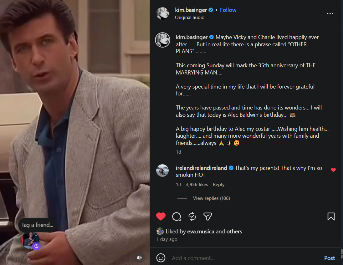 It is not often that Kim Basinger publicly acknowledges Alec Baldwin, especially after their complicated history. The 72-year-old actress took to Instagram to commemorate the 35th anniversary of the film *The Marrying Man*, the romantic comedy where the two first met and fell in love during filming in 1990. Alongside a nostalgic clip from the movie, Basinger wrote a heartfelt birthday message to Baldwin, who turned 68.